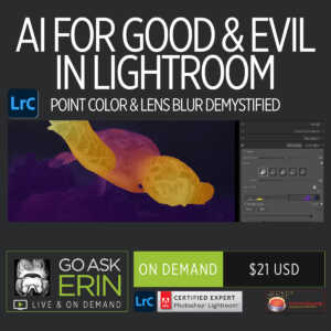 Go Ask Erin – Store Filter products Showing 1 - 50 of 50 results Categories On Demand 86Gift Cards 1Lightroom 36Develop 28Library 14Photoshop 33Premiere Pro 4Water Replacement 1 Price Order By DefaultDefaultReview CountReview CountPopularityPopularityAverage ratingAverage ratingNewnessNewnessPrice: low to highPrice: low to highPrice: high to lowPrice: high to lowRandom ProductsRandom ProductsProduct NameProduct Name Show only products on sale In stock only AI For Good and Evil in Photoshop – Part 2 – How to Edit Smarter Using AI Superpowers in PhotoshopAdd to cartContinue Loading Done AI For Good and Evil in Lightroom Classic – Part 1 – Point Color and Lens Blur DemystifiedAdd to cartContinue Loading Done Water Replacement Starter Pack – Water Column Replacement Images for PhotoshopAdd to cartContinue Loading Done New Masking Magic in Lightroom Classic v12 – A Dive Into Lightroom’s Most Powerful Editing ToolsAdd to cartContinue Loading Done The Eyes Have It! – Techniques to Emphasize Eyes Using Sharpness, Color, and Voodoo.Add to cartContinue Loading Done Photoshop Fear Abatement – How to Survive and Thrive in the Alien World of PhotoshopAdd to cartContinue Loading Done Goo Gone – How to Eliminate Backscatter and Other Unsightly Messes in PostAdd to cartContinue Loading Done New Tricks for the UW Sorcerer’s Handbook – Turn Your Editing World Upside-Down – Literally!Add to cartContinue Loading Done The Dark Arts – Intermediate Compositing and BeyondAdd to cartContinue Loading Done KEYWORDAPALOOZA – How to Find Anything Using Lightroom’s LibraryAdd to cartContinue Loading Done When Bad Things Happen to Good Shooters – Digital Disaster Relief in PostAdd to cartContinue Loading Done Mommy’s Little Helpers III – Ready to ride? Let’s do this!Add to cartContinue Loading Done Living on the Edge – Deep Dive into Contrast and SharpnessAdd to cartContinue Loading Done Artsy-Fartsy BundleView productsContinue Loading Done Artsy-Fartsy 101 – Making Eye-Catching AbstractsAdd to cartContinue Loading Done Thinking Outside the Box – Creative Exploration in Lightroom and PhotoshopAdd to cartContinue Loading Done Zero to Hero BundleView productsContinue Loading Done Dark Arts BundleView productsContinue Loading Done Video Editor’s BundleView productsContinue Loading Done Painting with Light in Lightroom and PhotoshopAdd to cartContinue Loading Done Big Bad Booby Traps in Lightroom and PhotoshopAdd to cartContinue Loading Done Mommy’s Little Helpers IIAdd to cartContinue Loading Done Avoiding (and amending) Rookie MistakesAdd to cartContinue Loading Done Mommy’s Little Helpers IAdd to cartContinue Loading Done Photoshop Zero to Hero IV – A World Beyond LightroomAdd to cartContinue Loading Done Dirty Tricks III – Which Craft is Witchcraft?Add to cartContinue Loading Done Lightroom Classic Zero to Hero IIIAdd to cartContinue Loading Done Lightroom Classic Zero to Hero IIAdd to cartContinue Loading Done Lightroom Classic Zero to Hero IAdd to cartContinue Loading Done Dirty Tricks II – Some Call it Cheating, But I Call it Fun!Add to cartContinue Loading Done Intro to Premiere Pro II – Advanced Color Correction, Time Ramping, Effects & Text TitlingAdd to cartContinue Loading Done Border Patrol – Selections and Masks using Lightroom and PhotoshopAdd to cartContinue Loading Done Office Hours – Power Pack 2Add to cartContinue Loading Done Lightroom’s Secret Powers – Tips, Tricks, and Badass Buried TreasureAdd to cartContinue Loading Done Intro to Premiere Pro I – Basics of Underwater Video EditingAdd to cartContinue Loading Done Compositing 101 – A Mad Skill You Can’t Live WithoutAdd to cartContinue Loading Done What’s Wrong With This Picture? – Develop Module WorkflowAdd to cartContinue Loading Done Dirty Tricks I – Some Call it Cheating, But I Call it Fun!Add to cartContinue Loading Done 65,536 Shades of Gray – How to Make Sexy Black and White ConversionsAdd to cartContinue Loading Done How to Fix Your F*ed-Up Catalog – Troubleshooting in LightroomAdd to cartContinue Loading Done Let There Be Light – Repositioning your Strobes in PostAdd to cartContinue Loading Done Office Hours – Power Pack 1Add to cartContinue Loading Done Intro to Photoshop – The Six Concepts You Need to Know to Make Photoshop Your BitchAdd to cartContinue Loading Done The Keys to Your Catalog – Collections, Keywording and FiltersAdd to cartContinue Loading Done Out Damn Spot-Part 2 – Intro to the Dark ArtsAdd to cartContinue Loading Done Out Damn Spot-Part 1 Basics of Backscatter RemovalAdd to cartContinue Loading Done Ban the Cyan-Minimizing Unwanted Ambient Light in Your ImagesAdd to cartContinue Loading Done Surviving the Import ModuleAdd to cartContinue Loading Done Don’t Cheat on LightroomAdd to cartContinue Loading Done Gift CardSelect amountContinue Loading Done This product has multiple variants. The options may be chosen on the product page