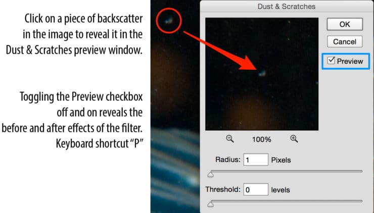 - Go to the filter menu and select Noise>Dust and Scratches. In the ensuing panel, reset both sliders to their lowest value all the way to the left. Radius should read 1 and Threshold 0. Click in your image on the piece of backscatter that you located earlier, and you’ll see it appear in the Dust & Scratches preview window. Move the Radius slider to the right until the spot has completely disappeared. Check your image. If there’s still a significant amount of backscatter, nudge the slider a little further to the right until most of it’s gone. Ignore any large or blurred particles – you’ll fix those later.